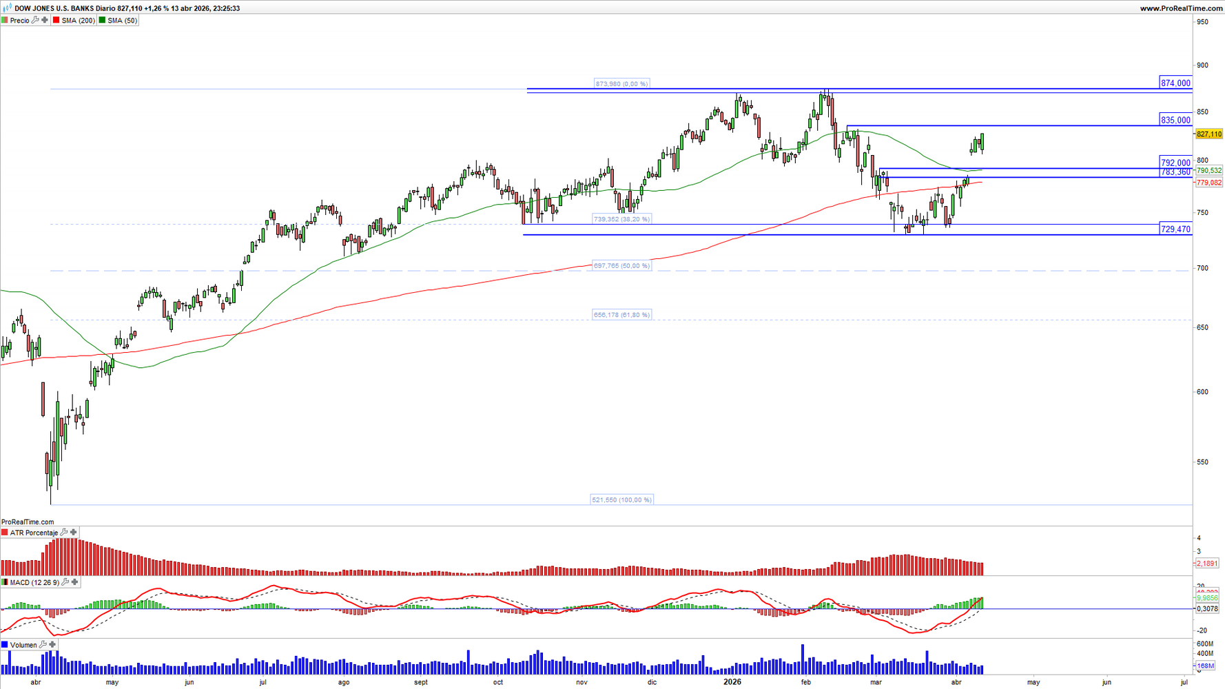 En el gráfico diario del sector bancario estadounidense (DJUSBK), observamos que el precio se