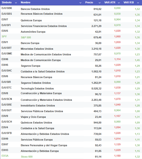 Ranking sectorial en Europa y en Estados Unidos basado en la variación de la volatilidad y la variación del RSI a cierres del viernes 20 de abril. Fuente: Prorealtime elaboración propia.
