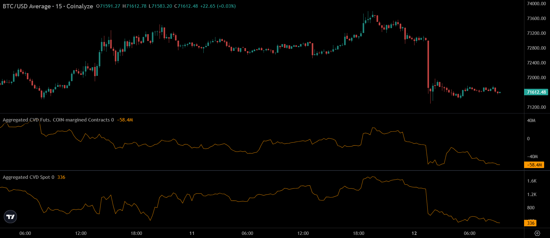 Pillows ha destacado una alineación bajista para Bitcoin cayendo bruscamente y las líneas CVD moviendo a la baja en lugar de divergir.