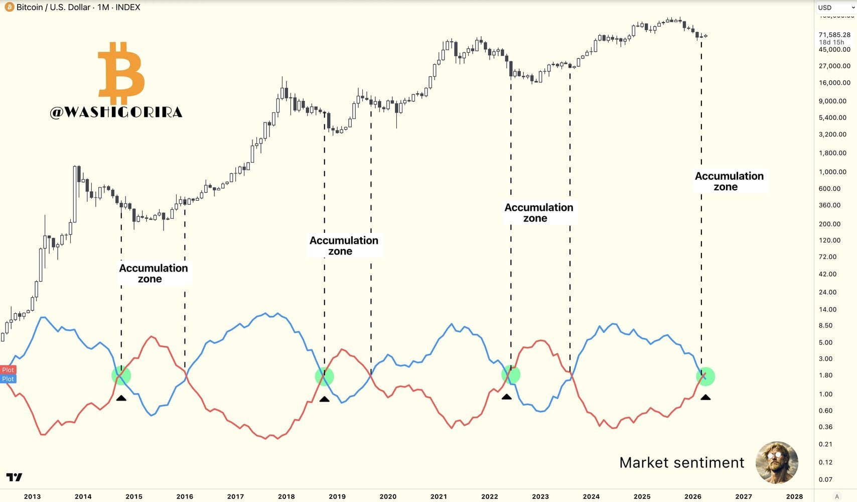El grafico compara ciclos pasados utilizando un indicador de sentimiento del mercado con dos líneas oscilantes. Cada vez que las líneas azul y roja alcanzaban la zona de cruce marcada, Bitcoin entraba o se movía a través de una zona de acumulación. Estas aparecían cerca de ciclos de mínimos anteriores y no de máximos, pudiendo ser una zona donde los compradores pacientes prestaban más atención.
