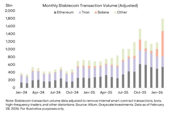 Las monedas estables y la actividad de pago real han cobrado relevancia en el blockchain de Solana (SOL).Grayscale Investment ha señalado que durante febrero ha alcanzado un récord de volumen de transacciones de stablecoins por 650 millones de dólares, según Christian Encila en News BTC.