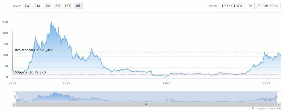 La resistencia a mediano y largo plazo se encuentra en los 121.49 dólares. Mientras, los indicadores de Ei se muestran mixtos.