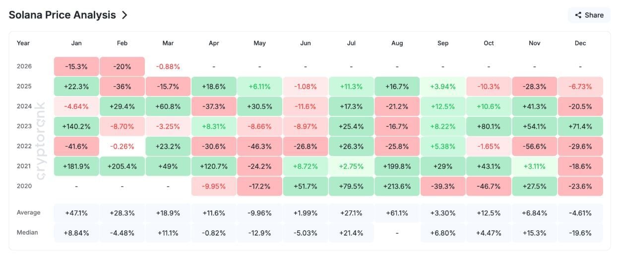 Abril ofrece escaso estímulo estacional. La rentabilidad media histórica de SOL en abril se sitúa en el -0.82%, lo que lo convierte en uno de los meses más débiles registrados. Dado que 2026 ya ha roto varios patrones estacionales a la baja, basarse únicamente en los promedios históricos sería arriesgado.