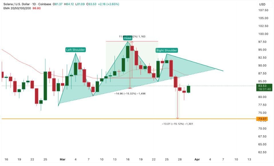 El precio de Solana (SOL) llega a fin de marzo con una racha negativa de seis meses desde octubre del 2025, cerrando el mes con una caída del -0.88% A esto le debemos sumar la confirmación de un patrón técnico de hombro-cabeza-hombro (HCH), el cual abre la posibilidad de la búsqueda de un soporte o de mayores caídas según Ananda Banerjee en Beincrypto.