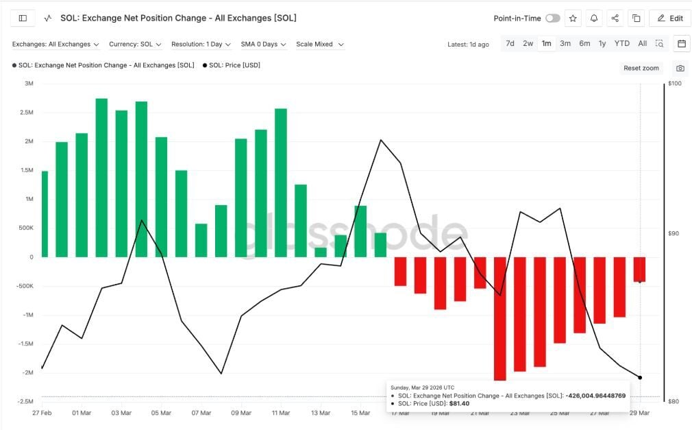 Los datos en la cadena de bloques muestran que la presión compradora que impulsó a SOL hasta mediados de marzo se ha desvanecido al comenzar abril. El cambio en la posición neta de los exchanges, una medida del flujo de tokens dentro y fuera de las plataformas, mostró una fuerte acumulación entre el 17 y el 22 de marzo, alcanzando un máximo de aproximadamente -2.180.253 SOL. Esta lectura negativa indicaba que las criptomonedas estaban saliendo de los exchanges, una señal clásica de compras al contado.