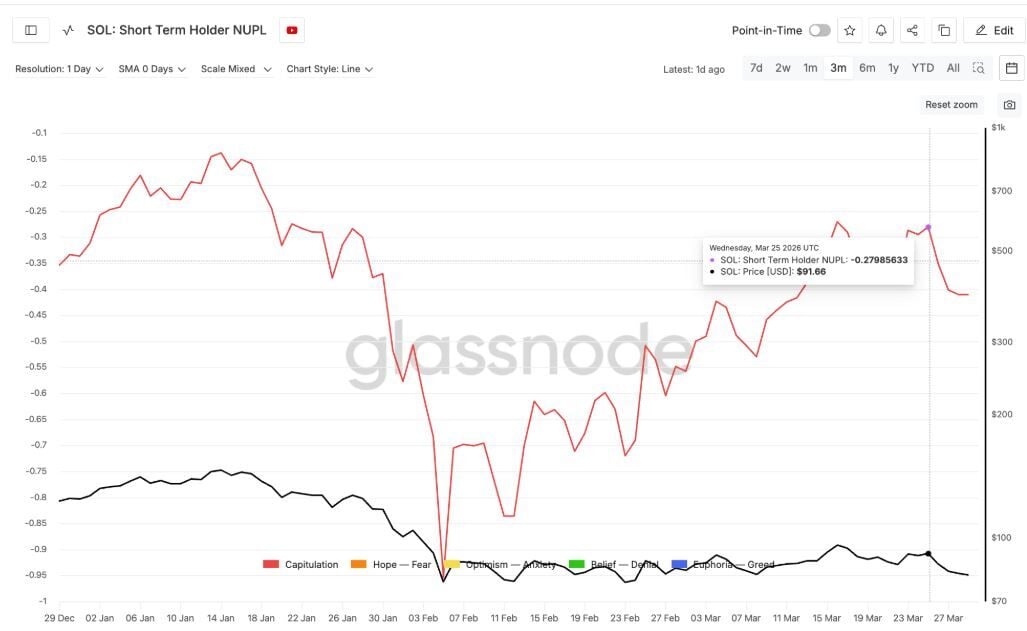 La NUPL de STH ha aumentado drásticamente desde una profunda capitulación de -0.95 el 5 de febrero hasta -0.27 el 25 de marzo. Actualmente se sitúa en torno a -0.40. Si bien sigue siendo negativa, los tenedores a corto plazo ahora registran pérdidas mucho menores que hace unas semanas.