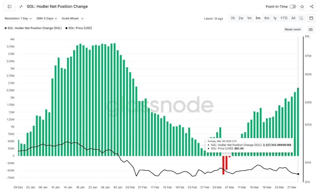 El único indicador que contradice el escenario bajista es la acumulación de posiciones por parte de los inversores a largo plazo. El valor del cambio neto de la posición de los inversores a largo plazo aumentó de 523.624 SOL el 8 de marzo a 2.327.302 SOL el 29 de marzo, un incremento de más del cuádruple. Se trata de participantes a medio y largo plazo que están adquiriendo posiciones de forma agresiva y podrían proporcionar un soporte psicológico para los inversores a corto plazo que estén considerando vender.