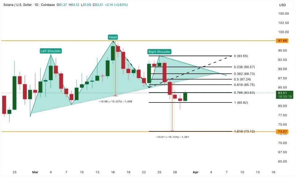 El nivel de precio más crítico para Solana a principios de abril es de 80 dólares. Este nivel coincide con un soporte a corto plazo. Un cierre de vela diario por debajo de 80 dólares haría que el objetivo de 73 dólares fuera mucho más realista, abriendo la puerta a una caída del 15% desde el punto de ruptura.