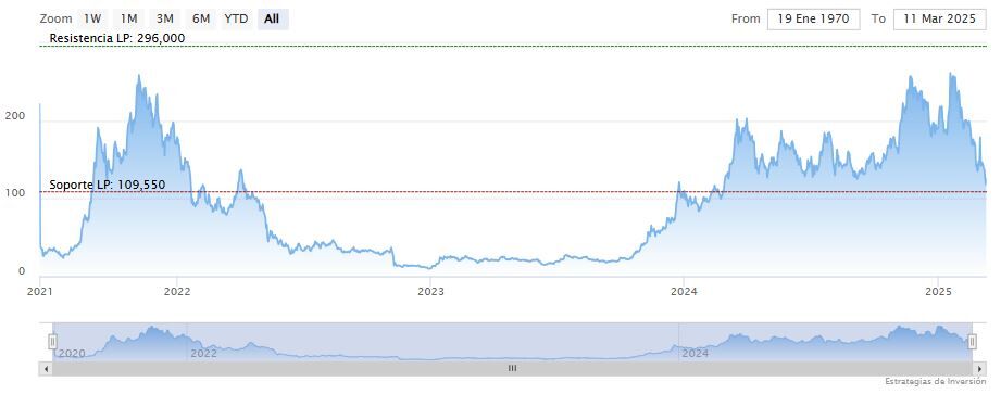 Un rebote desde este punto podría indicar una recuperación o una reversión temporal, mientras que una ruptura por debajo podría exacerbar la tendencia bajista.