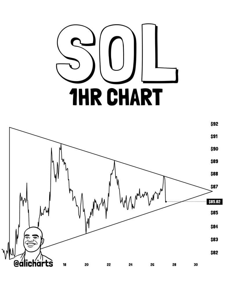 A continuación, se muestra el gráfico compartido por Martínez que ilustra el triángulo simétrico dentro del cual el precio horario de Solana ha estado operando durante las últimas semanas: