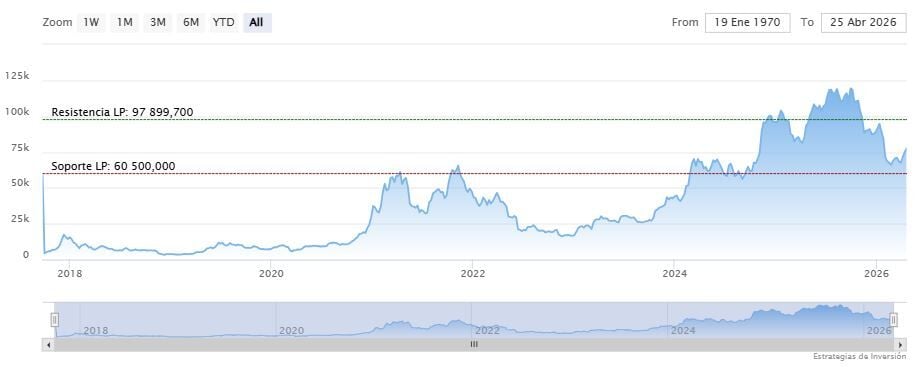 La resistencia a mediano plazo se encuentra en los 79.490 dólares. Mientras, los indicadores de Ei se muestran mixtos.