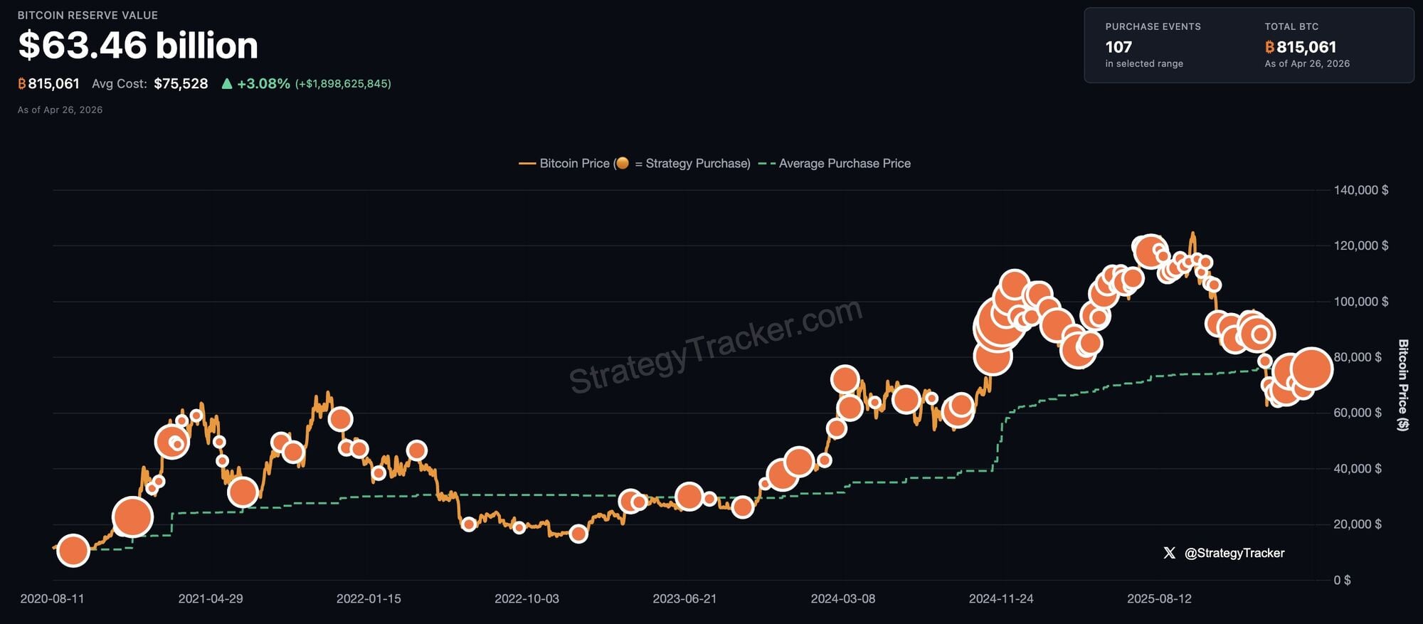 Strategy Rg-Asigue firme en su negocio de tesorería de Bitcoin (BTC) y el pasado 26 de abril alcanzaba un récord de tenencias con 63.460 millones de dólares equivalentes a 815.061 BTCs en 107 operaciones de compra a un precio promedio de 75.528 dólares por moneda.