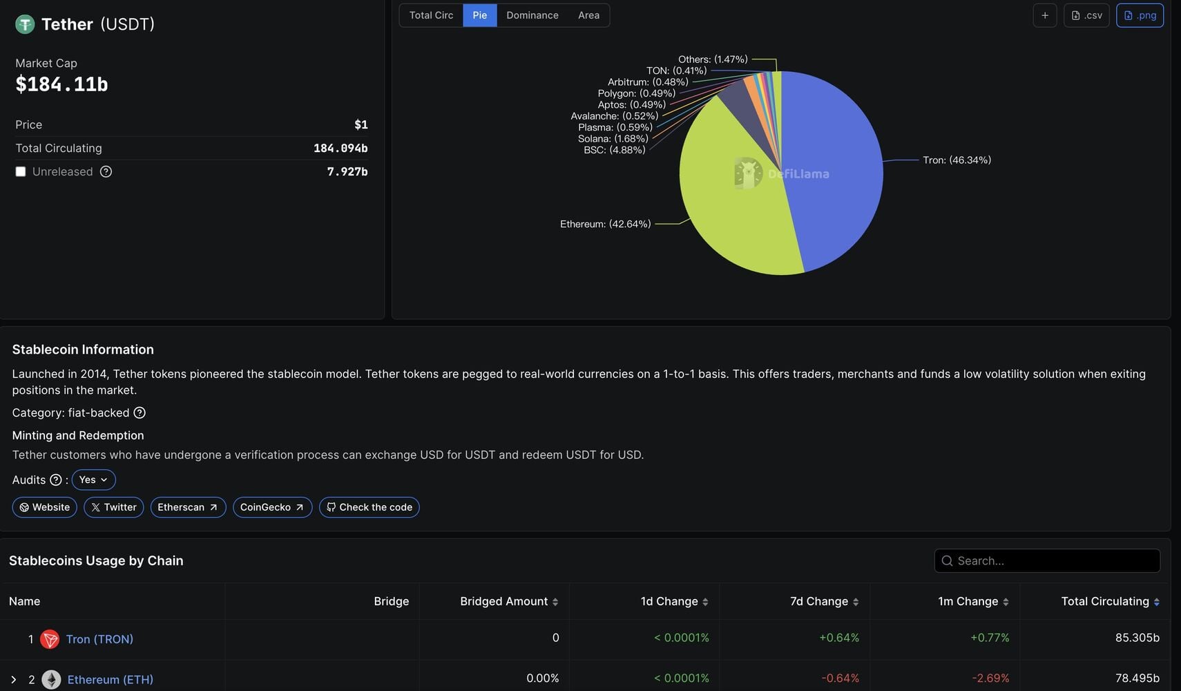 Sin embargo, al 11 de marzo, el sitio web oficial de Tether informa que el total de USDT en circulación en múltiples blockchains asciende a aproximadamente 184.9 mil millones de dólares. Ethereum lidera con 92.38 mil millones de dólares, seguido de cerca por Tron con 85.39 mil millones de dólares, que juntos representan más del 95% de la circulación total de la stablecoin.