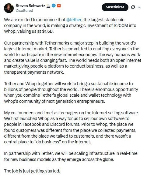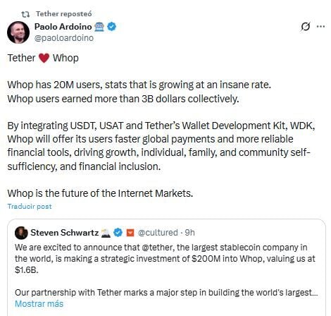 El cofundador de Whop, Steven Schwartz, declaró en una publicación en X que la inversión de Tether elevó la valoración de la compañía a 1.600 millones de dólares. Como parte del acuerdo, Whop integrará el Kit de Desarrollo de Monederos (WDK) de Tether, lo que permitirá a los usuarios enviar y recibir pagos en stablecoins como USDT.