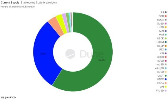 En Ethereum, USDT y USDC representan casi el 90% de la oferta de stablecoins en circulación, según datos de Dune Analytics. Esto refuerza su papel como la principal plataforma de intercambio de dólares para el comercio y la liquidación de criptomonedas.