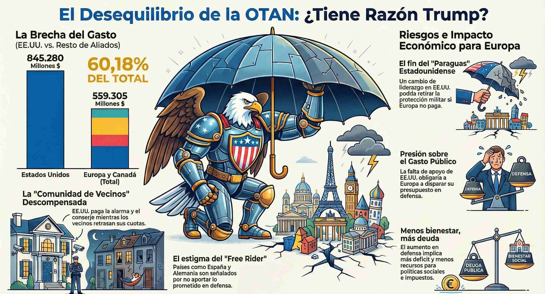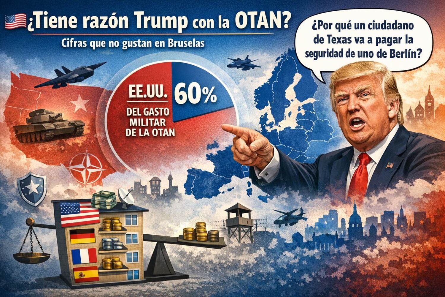 Imaginemos por un momento que la OTAN fuese una comunidad de vecinos. En la planta de arriba vive Estados Unidos: tiene la casa más grande, paga la mayoría de los gastos de la escalera, el ascensor, la portería y hasta la alarma. Abajo, en los pisos más pequeños, están Alemania, Francia, Italia o España… que prometieron aportar lo suyo, pero se han ido retrasando. Eso sí, todos quieren vigilancia 24 horas, videovigilancia, conserje y respuesta rápida ante emergencias.
