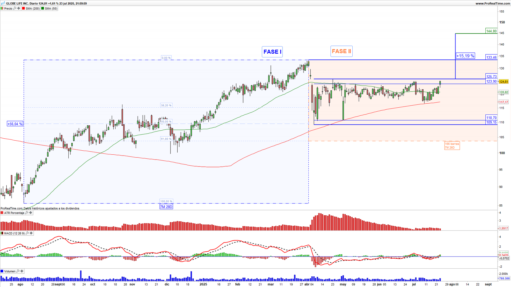Globe Life (GL) en escala diaria con volatilidad (gráfico central superior), MACD (gráfico central inferior) y actividad de contratación (ventana inferior). Fuente: ProRealTime y elaboración propia.