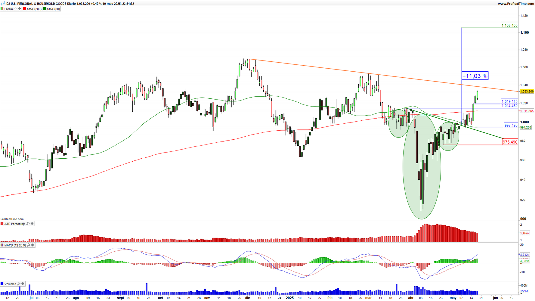 Durante las últimas sesiones hemos asistido a una recuperación en el mercado estadounidense tras los contactos establecidos entre Estados Unidos y China, los cuales han servido para establecer una calma en las tensiones arancelarias entre ambos países. En este sentido, el sector bienes personales y del hogar del mercado estadounidense ha presentado una mejoría significativa durante las últimas sesiones tras activarse un importante objetivo alcista, de modo que, (1) en este informe vamos a establecer un análisis del Dow Jones U.S Personal & House Goods para detectar los niveles relevantes en el sector y (2), posteriormente, establecemos un análisis de tres compañías vinculadas al sector que presentan un buen aspecto técnico, con altas probabilidades de tener un comportamiento positivo durante las próximas sesiones.