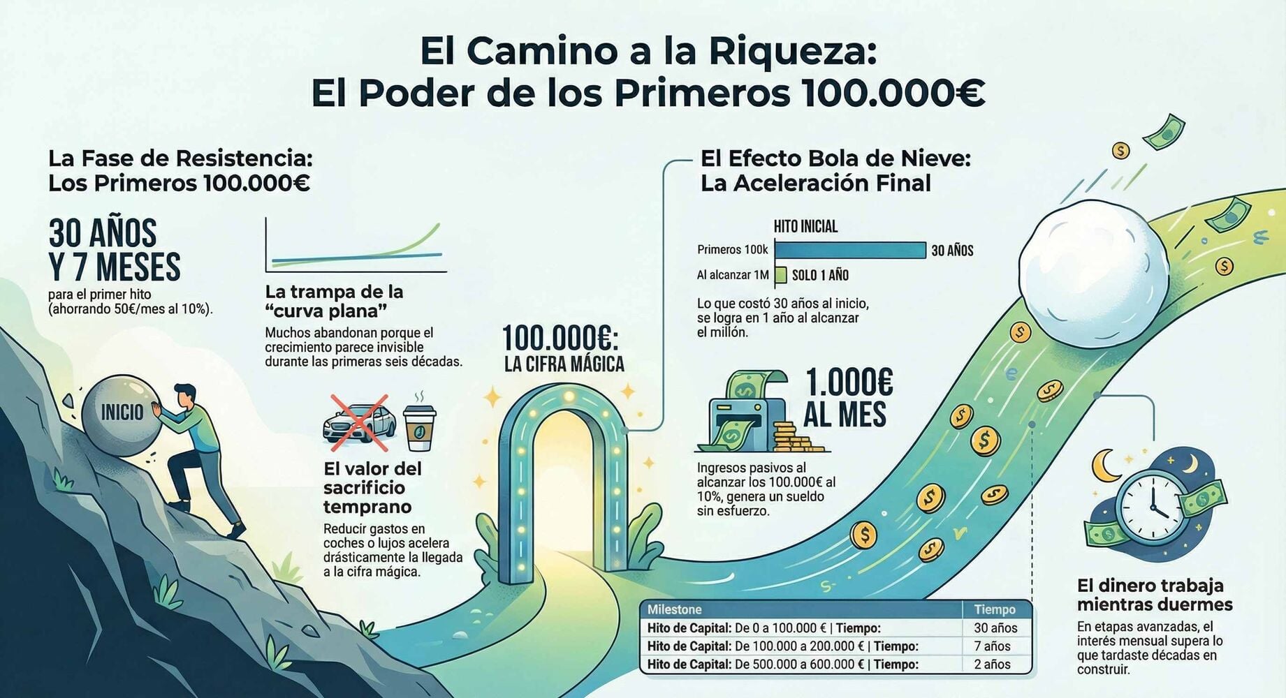 Por simplificar, los primeros 100 mil euros te cuesta conseguirlos 30 años (con ese ahorro de 50 euros mensuales). Los siguientes 100 mil, te lleva 7 años. Y pasar de 500 mil a 600 mil, te cuesta solo 2 años. Con 1 millón, tardas 1 año en los siguientes 100 mil. Y así… Lo que tardaste 30 años, ahora lo consigues en menos de 1 año. Es una maravilla. Pero ¿estás dispuesto a aguantar? Esa es la pregunta.