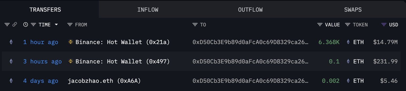 Pero no fue el único que hizo un gran movimiento. Según Lookonchain en X, El gestor de cartera Jacob Zhao realizó un retiro importante del exchange Binance. Su billetera movió 6.368 ETH por un valor de 14.79 millones de dólares en una sola transacción.