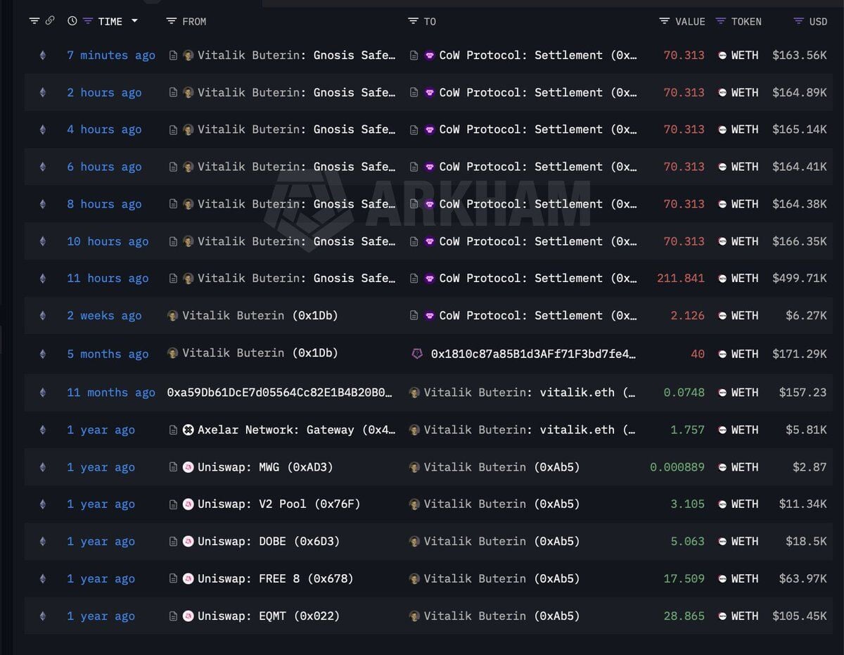 Si hay alguien que sabe los fundamentos de una criptomoneda son sus fundadores, por ello cualquier movimiento por parte de ellos es de relevancia y cuestionado por los inversores. Según Crypto patel en X el cofundador de Ethereum (ETH), Vitalik Buterin, ha vendido 493 ETH valorados en 1.16 millones de dólares en medio de una corrección de su valor.