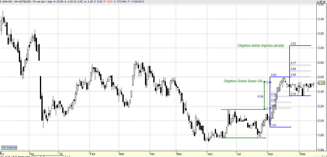NH Hoteles es un valor que me gusta y tiene una situación interesante en el corto plazo. Al comenzar Agosto confirma la figura de doble suelo y marca un objetivo en los 2,54€ ya cumplido. Esto le da pie a formar un primer impulso alcista. Si cierra por encima de los 2,60€ se confirmaría un segundo impulso en la zona de los 3€ que podría reportar un buen porcentaje de beneficios.