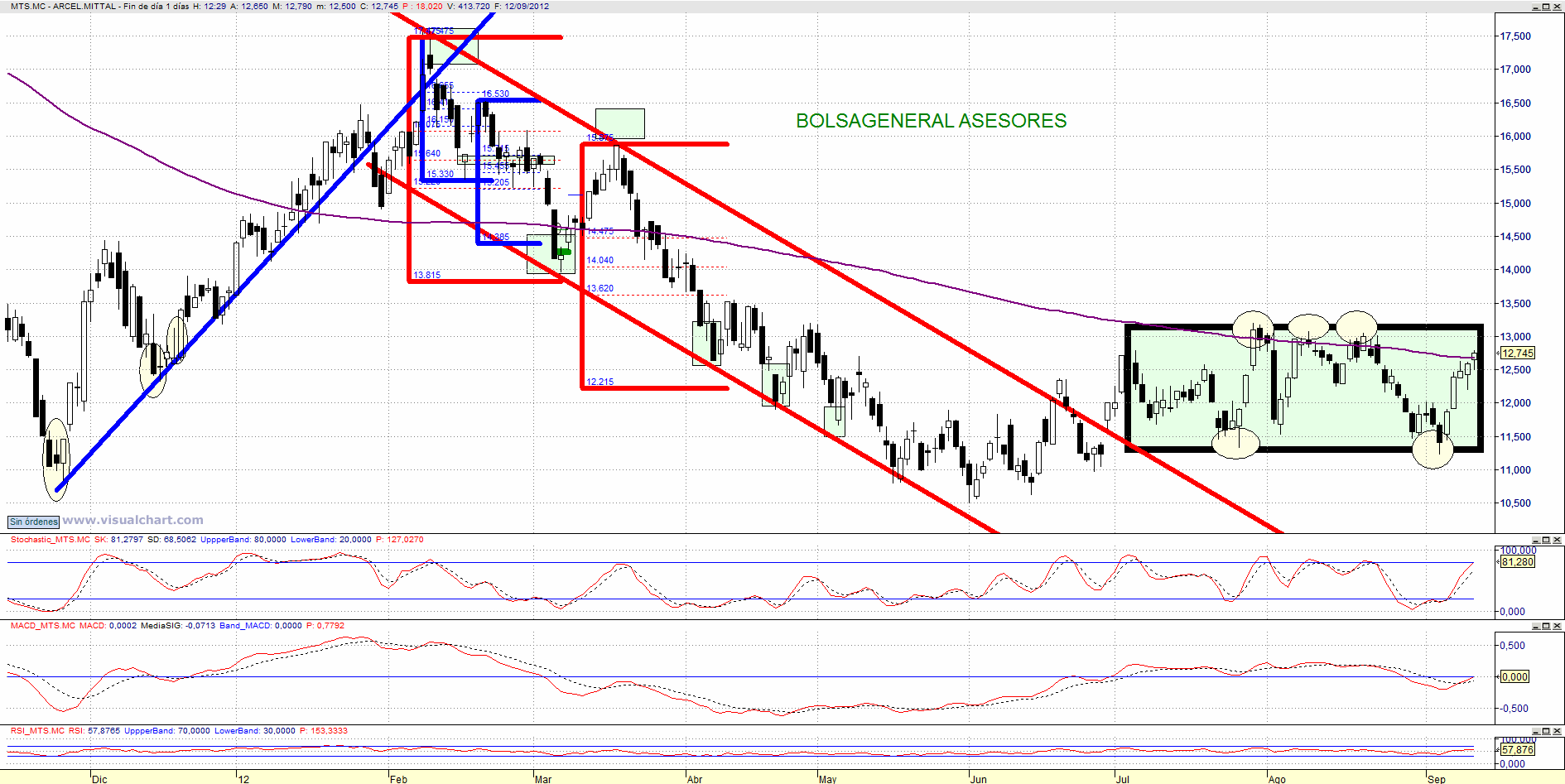 Arcelor Mittal de momento no ha roto nada. Tiene primera resistencia en los 13,20 euros si la supera podríamos tener más subidas. Está chocando con la media de 200 sesiones y dentro de una figura rectangular. En el momento que la rompa activaría objetivo de 2 euros. Veremos por donde la rompe.