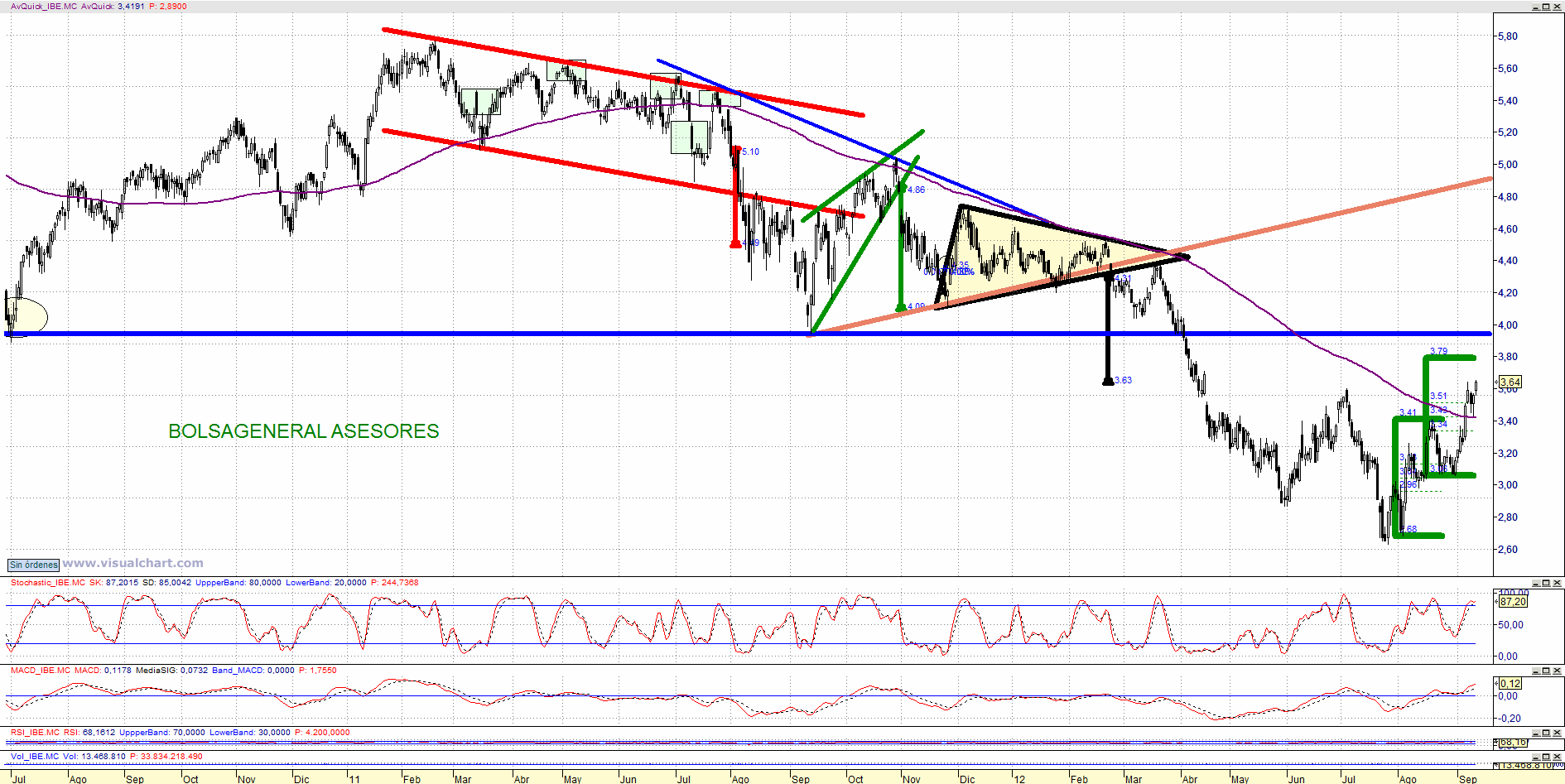 Buenos días Domingo. En el caso de Iberdrola podemos ver como se encuentra en fase de rebote de corto plazo con estructura de segundo impulso alcista con objetivo teórico en los 3,79 euros. Primeros soportes en los 3,42 euros y sobre todo en los 3,06 euros.