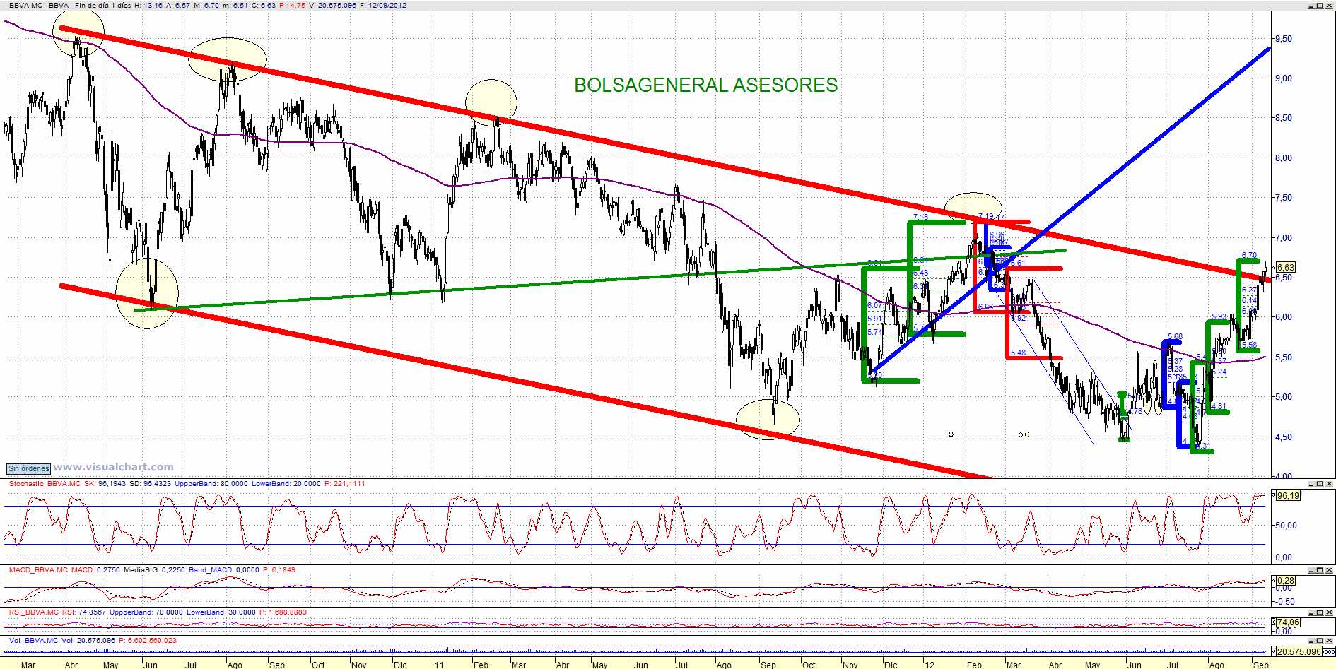 En el caso de BBVA Podemos ver como el título se encuentra en tendencia alcista de corto plazo pero prácticamente ya ha desarrollado una perfecta y clarísima estructura de 3 impulsos alcistas. Además se acerca a la zona del último máximo decreciente de medio plazo en los 7,05 euros. Se encuentra además intentando romper al alza el techo del canal bajista de medio/largo plazo. De superar los 7,05 confrimaría mejoría para medio plazo.