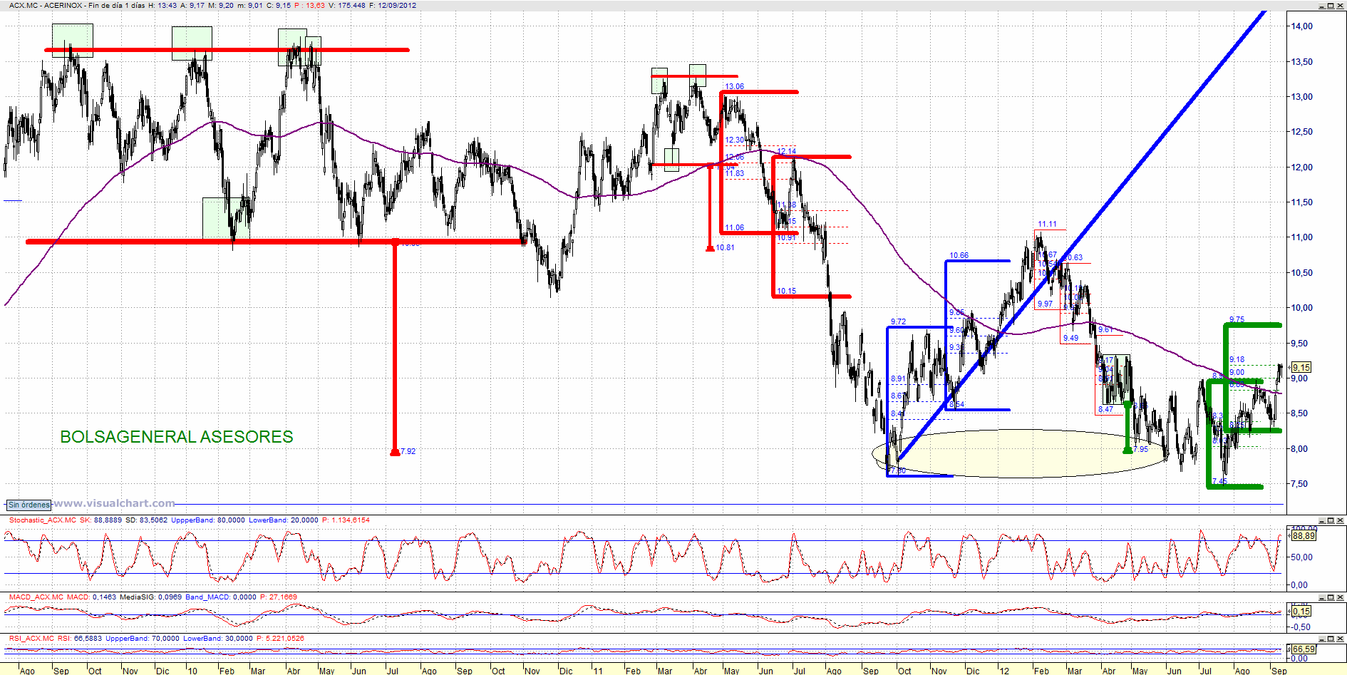 En el caso de Acerinox podemos ver como ha superado la resistencia de los 8,98 euros y tiene una estructrua de segundo impulso alcista en marcha con objetivo teórico en los 9,75 euros aprox. Veremos si lo logra en próximos meses. Fundamental que no pierda los 8,24 euros.