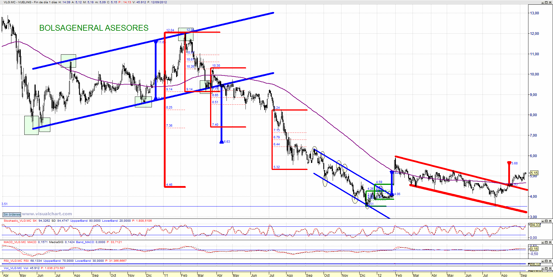 Buenas tardes Jose Maria. Vueling se encuentra en tendencia alcista de corto plazo y ha roto al alza el canal bajista en el que se movía. Adem´sa ha encontrado apoyo en el importantísimo soporte de los 3,50/3,60 euros.. En el medio plazo ese es el soporte clave. No es de los valores que más me gustan pero ha mejorado en el corto plazo.