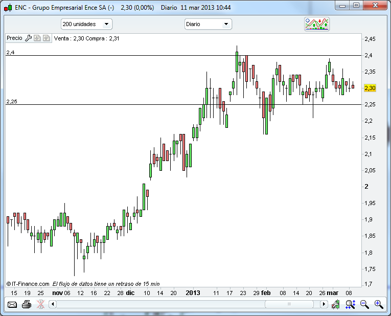 Efectivamente Ence ha perdido su tendencia alcista. Durante todo el 2013 el valor se ha visto inmerso en un movimiento lateral entre los 2,25 y los 2,40 salvo contadas excepciones. Hay que tener en cuenta que viene de una subida muy fuerte del 70% desde junio de 2012 y que está asentando niveles. Por ahora tiene un aspecto poco interesante.