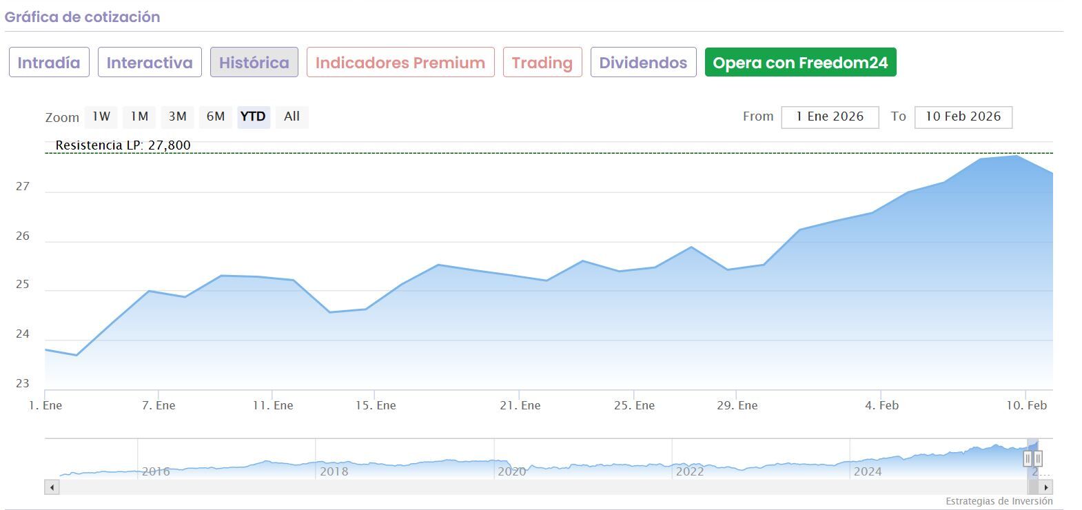 Un valor al que apenas le separa un 1,15% de sus máximos del pasado 6 de febrero, día en el que subió hasta los 27,80 euros por acción y que remonta, desde los mínimos del 9 de abril, tras los aranceles, un 28% desde los 19,9 euros por acción.