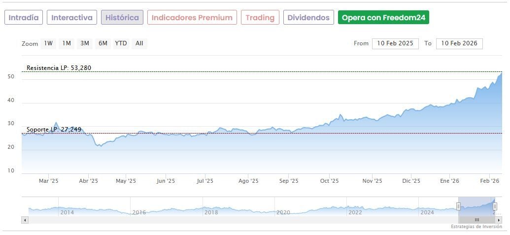 Las acciones de ArcelorMittal suben un 2,69% a media mañana en el IBEX 35 hasta marcar 54,16 euros, marcando nuevos máximos después de haber subido ya un 38,6% solo en lo que va de 2026. Se disparan un 163,8% desde sus mínimos de las últimas 52 semanas, fijados en 20,53 euros desde el 7 de abril del año pasado.