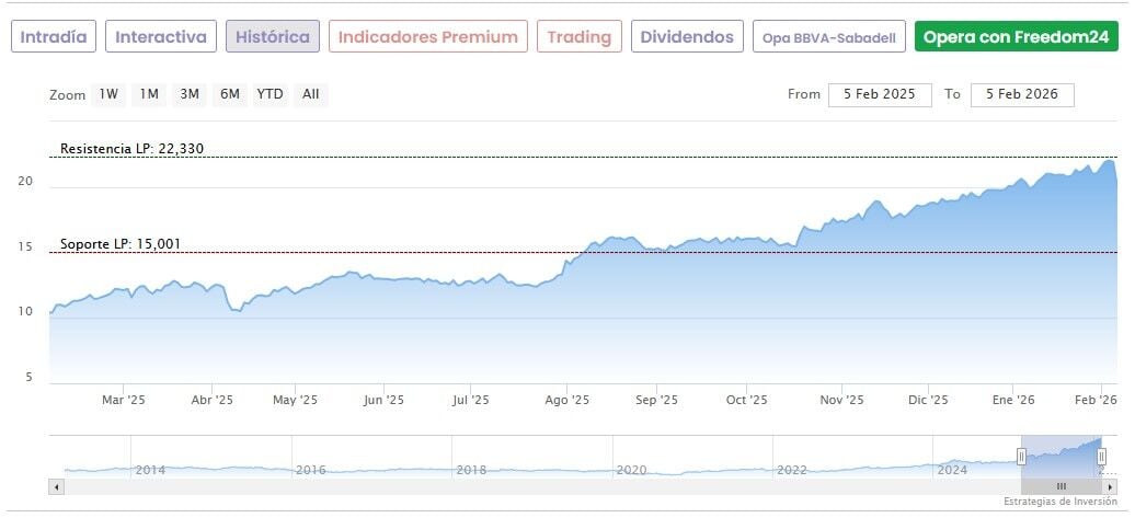 Los títulos tocaron el 3 de febrero unos nuevos máximos en 22,33 euros, con una corrección de un 8,3% desde entonces. Hoy los títulos rebotan un 2,45% a media mañana hasta marcar 20,47 euros en el IBEX 35 a media mañana.
