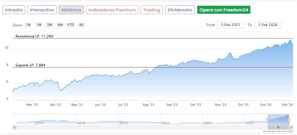 Las acciones de Banco Santander llegaron a tocar unos máximos históricos de 11,26 euros el pasado 3 de febrero, pero han corregido un 7% desde entonces. Eso sí, se han disparado un 125% desde sus mínimos de las últimas 52 semanas, situados en los 4,645 euros desde abril del año pasado.