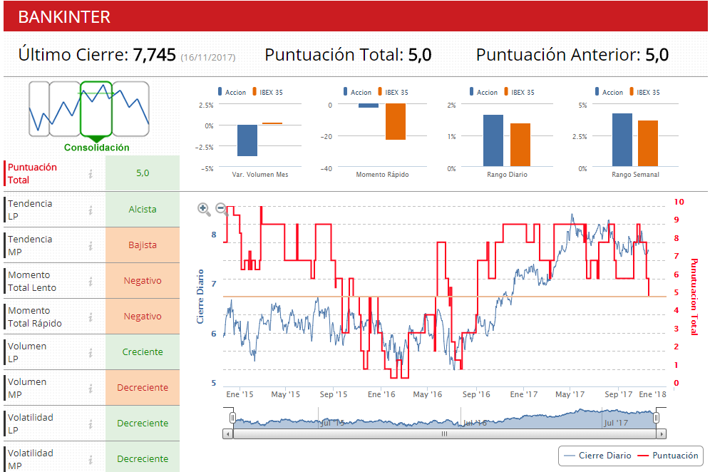 Los indicadores técnicos de la zona premium de Estrategias de Inversión dan una puntuación a Bankinter de 5 sobre 10, compañía que se encuentra en fase de consolidación, con una tendencia bajista en el medio plazo pero alcista en el largo, y una volatilidad decreciente en ambos periodos En septiembre, Bankinter tenía una puntuación de 9 sobre 10, que ha ido bajando al tiempo que ha retrocedido el mercado español.