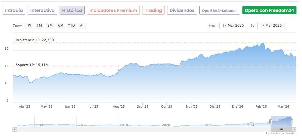 Las acciones de BBVA subían a primera hora de la mañana un 1,43% en el IBEX 35 hasta marcar 18,39 euros, si bien todavía se dejan un 8% en lo que va de 2026. Los títulos llegaron a conquistar unos máximos históricos de 22,33 euros el 3 de febrero de este año, pero desde entonces registran una caída de un 17,6%.