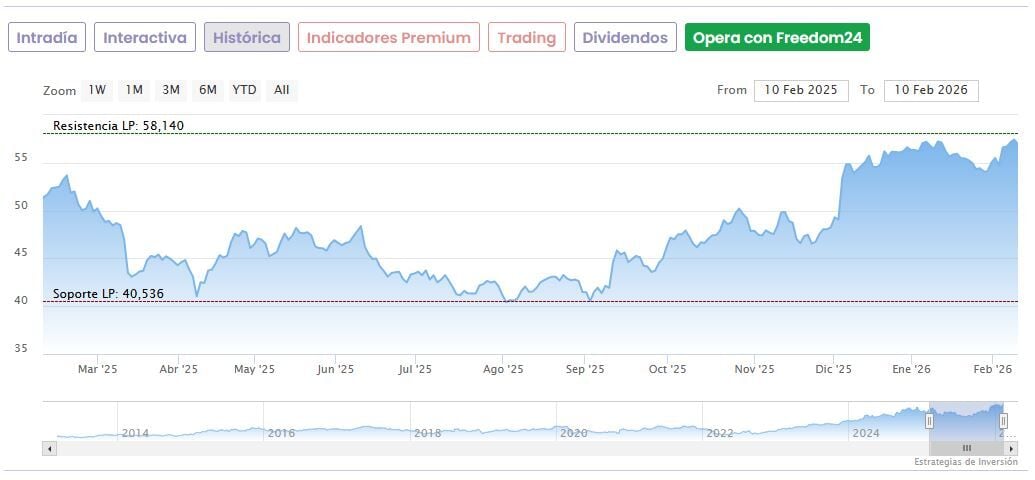Las acciones de Inditex tocaron un máximo histórico en 58,14 euros el pasado día 5 de este mes de febrero, pero desde entonces han recortado un 2,27%. Los títulos acumulan una subida de un 39,3% desde los mínimos de las últimas 52 semanas, fijados en 40,80 euros desde el 4 de agosto del año pasado, pero en los últimos 12 meses la subida es más modesta, de un 6,2%.