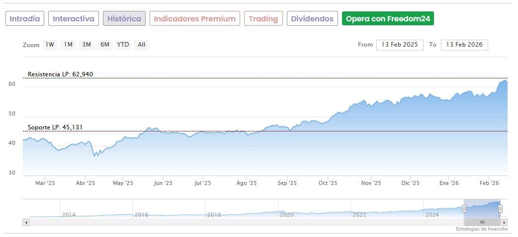 Hoy las acciones de Ferrovial suben un 0,65% a media mañana hasta marcar 61,80 euros en el IBEX 35, acercándose de nuevo a los máximos por encima de los 62 euros que marcó la semana pasada. Los títulos han subido un 72,7% desde que en abril del año pasado marcaron mínimos de las últimas 52 semanas en 35,781 euros.
