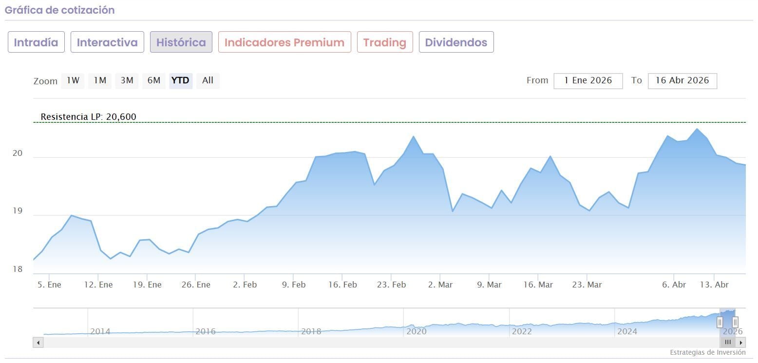 Lo cierto es que su trayectoria sigue siendo favorable en lo que va de año, a pesar de las caídas de la última semana para el valor. En concreto, sube un 8,5% en el ejercicio, mientras que apenas baja un 3,37% desde sus máximos marcados el pasado 8 de abril en los 20,60 euros por acción.