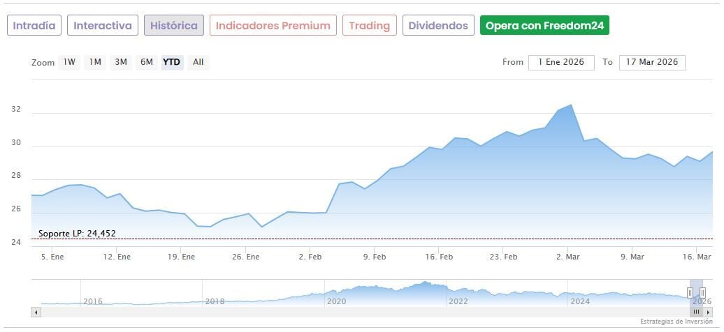 Hoy las acciones de Cellnex bajan un ligero 0,37% a media mañana, aunque suben todavía un 19,46% desde que el 22 de enero tocaron mínimos de las últimas 52 semanas en 24,77 euros.