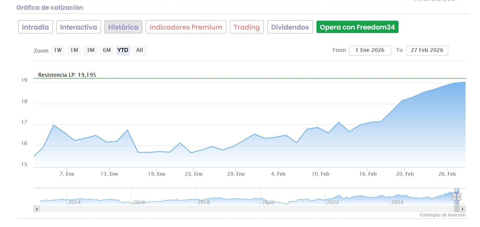 La compañía sube en lo que va de año un 23% a sumar las ganancias de hoy y solo un 20% se acumula en mejor durante el último mes, con avances del 9% en la última semana.