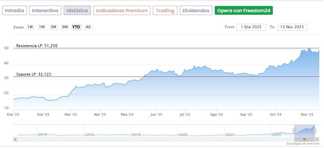 Indra es, con diferencia, el mejor valor del IBEX 35 en lo que va de 2025, acumulando una revalorización del 186% al calor de los planes de los Gobiernos europeos (incluido el español) de incrementar el gasto en defensa. Las acciones llegaron a marcar un máximo histórico de 51,24 euros el pasado 4 de noviembre, si bien desde entonces caen un 4,3%. Su punto más bajo del año lo tocaron en febrero, cuando llegaron a bajar a 16,10 euros. Desde entonces, la subida es de nada menos que un 204%.