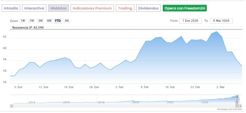 Hoy las acciones de Ferrovial bajan un 2,73% hasta marcar 55,50 euros a media sesión en el IBEX 35. Los títulos sufren una corrección del 12,65% desde que el pasado 27 de febrero tocaron unos máximos de 63,54 euros.
