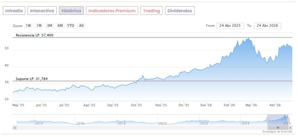 Las acciones del gigante del acero acumulan una revalorización de un 115,65% desde sus mínimos de las últimas 52 semanas, fijados en los 23,52 euros desde el 22 de abril del año pasado, y eso que han corregido un 11,64% desde que el 25 de febrero marcaron unos máximos de 57,40 euros.