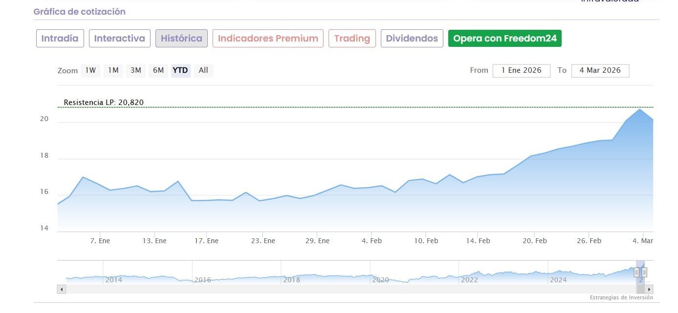 En lo que va de año, Repsol se ha convertido ya en el tercer mejor valor del Ibex 35 en 2026 contra pronóstico, porque no se esperaba un crudo al alza en este año antes del conflicto, con repuntes que superan el 32% solo por detrás de Indra y de ArcelorMittal. en el mes avanza un 21,5% y en el trimestre sube en bolsa un 10,37%.