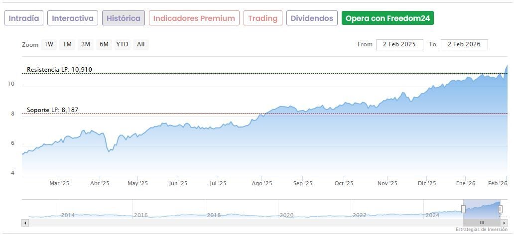 Hoy las acciones de CaixaBank suben un moderado 0,21% a media mañana hasta marcar 11,435 euros en el IBEX 35, superando ya los máximos históricos de 11,41 euros de la negociación de ayer lunes. Los títulos acumulan una subida de un 9,47% en este arranque de 2026, mientras que en los últimos 12 meses el alza es de un 97,4%.
