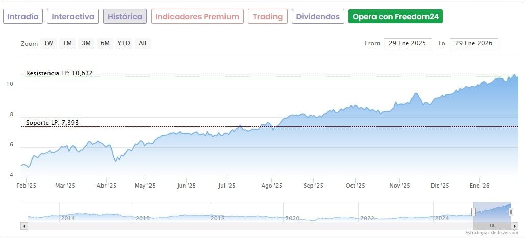Y es que hoy las acciones del banco se anotan una subida a media mañana en el IBEX 35 de un 1,20% hasta marcar 10,754 euros. Los títulos vuelven a tener a tiro (-0,85%) sus máximos históricos, vigentes desde el 28 de enero en los 10,846 euros.