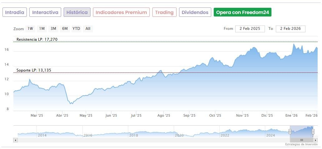 Las acciones de Repsol se pierden las subidas del IBEX 35 en la mañana de este martes, con un descenso a media mañana de un 0,61% hasta marcar 16,26 euros. La petrolera ha corregido un 5,85% desde que el 6 de enero tocó unos máximos de 17,27 euros en el parqué, aunque todavía suben un 2,10% en lo que va de 2026. En los últimos 12 meses, la subida es de un 43,76%.